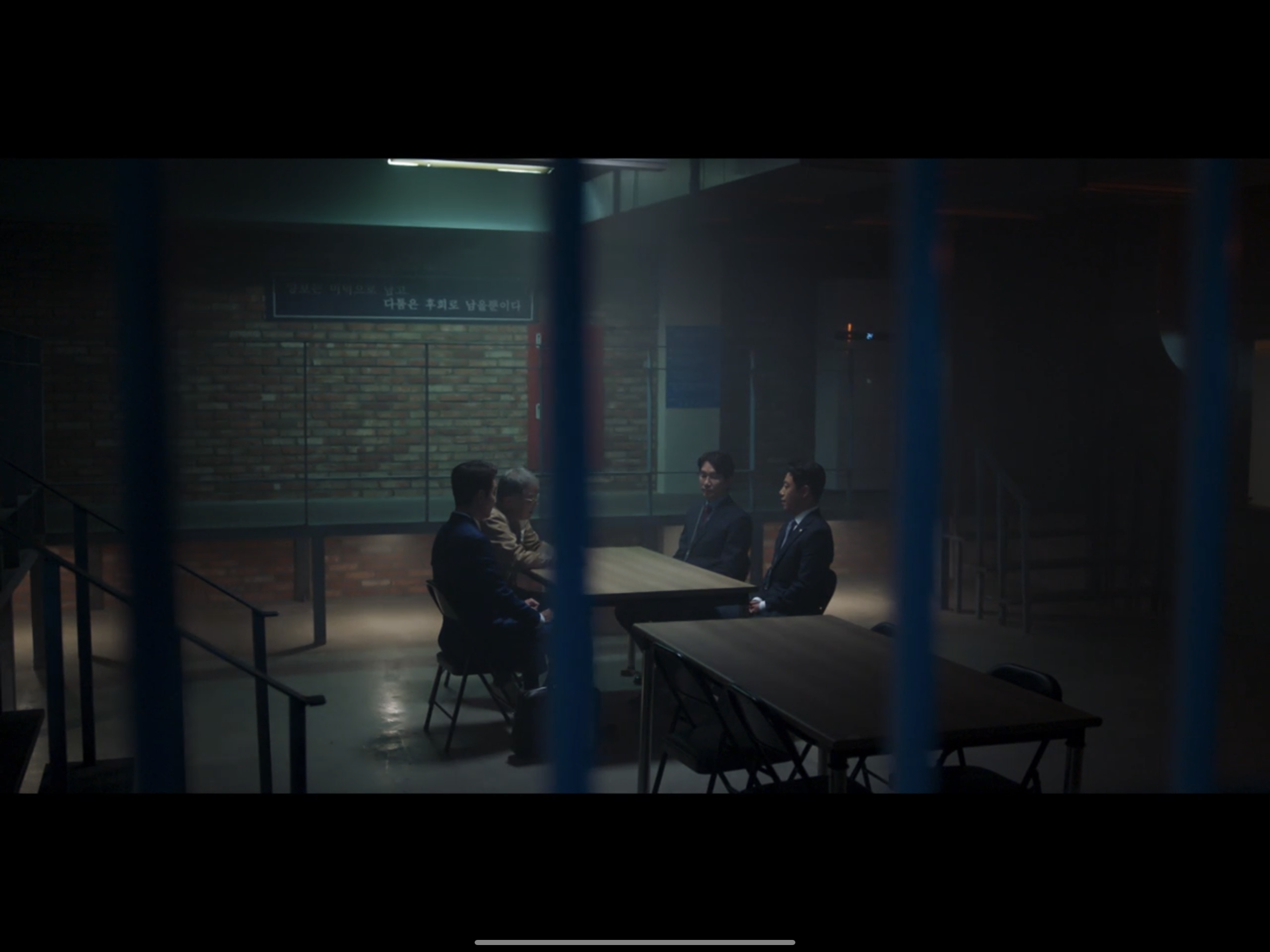 횡령혐의로 구속,징역 위기에 몰린 우원그룹의 회장 김우원(정원중)과 그의 측근들이 모여 논의를 벌이는 씬이다.