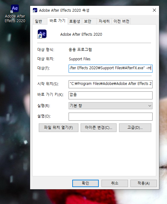 ▷바탕화면에 애프터이펙트(애팩) 아이콘을 둔다